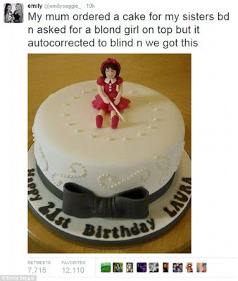 Marie Seggie, de Lanarkshire en Escocia, ordeno un pastel con una figura de una joven para celebrar el número 21 de su hija y pidió que se escribirá «chica rubia» (blond girl), con el objetivo de representa a la muchacha, pero sin notarlo, pero el autocorrector cambió el pedido por «una chica ciega» (blind girl)