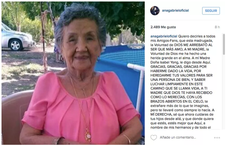 La tristeza inunda el corazón de Ana Gabriel y su familia, ya que dieron la noticia del fallecimiento de la madre de la cantante, la señora Isabel Yong.