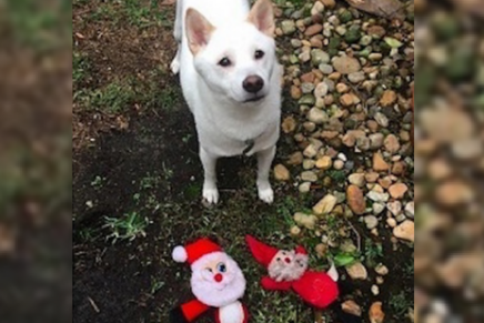 Kya es una blanca perrita raza Shiba a la que le encanta jugar con un peluche de Santa Claus. Lo lleva a todas partes y ahora que se aproxima Navidad se llevó una gran sorpresa.