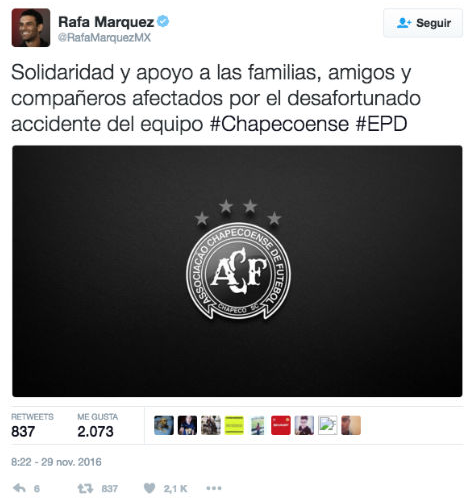 Rafael Márquez capitán de la selección mexicana escribió: “Solidaridad y apoyo a las familias, amigos y compañeros afectados por el desafortunado accidente del equipo Chapecoense”