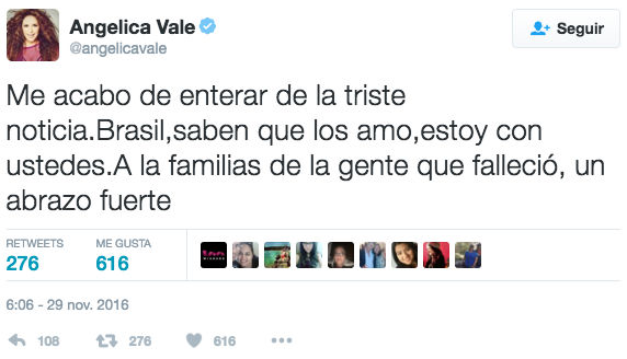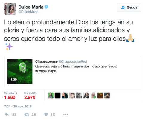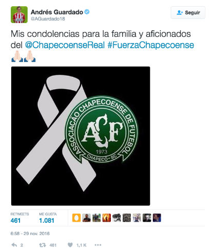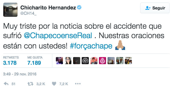 “Muy triste por la noticia sobre accidente que sufrió Chapecoense. Nuestras oraciones están con ustedes”.
