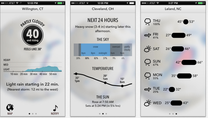 2. Dark Sky: Al descargar Dark Sky, la app envía notificaciones, las cuales advierten si va a llover o nevar en la zona en donde se encuentren. Sólo hay una versión para iOS disponible.