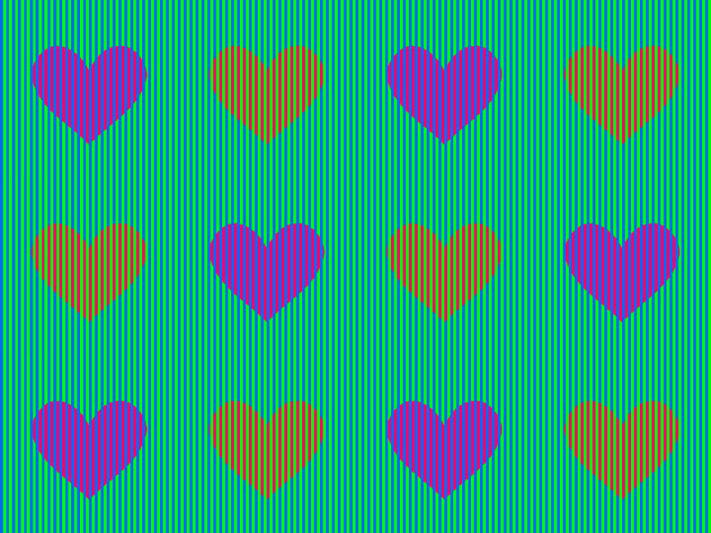 ¿Por qué lo vemos azul en lugar de verde? La respuesta está en los colores cercanos. El cerebro interpreta los tonos de manera diferente según qué otros colores tenga al lado de lo que ve. En la imagen, el verde se mezcla con el magenta para dar lugar a un tono azulado. Ocurre lo mismo en esta otra imagen en la que hay corazones rosas y naranjas, cuando en realidad todos son rosas.