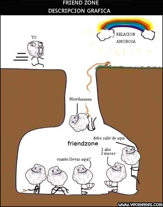 La friendzone, o zona de amigos, es ese oscuro lugar en los caminos del amor al que cualquiera puede llegar, pero del que nadie sabe cómo salir. ¿Es un gran túnel, un hoyo o un laberinto? Aún se desconoce porque muy pocos han podido librarse de las tinieblas y sólo quieren borrar esos recuerdos.