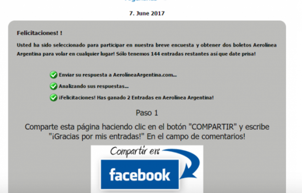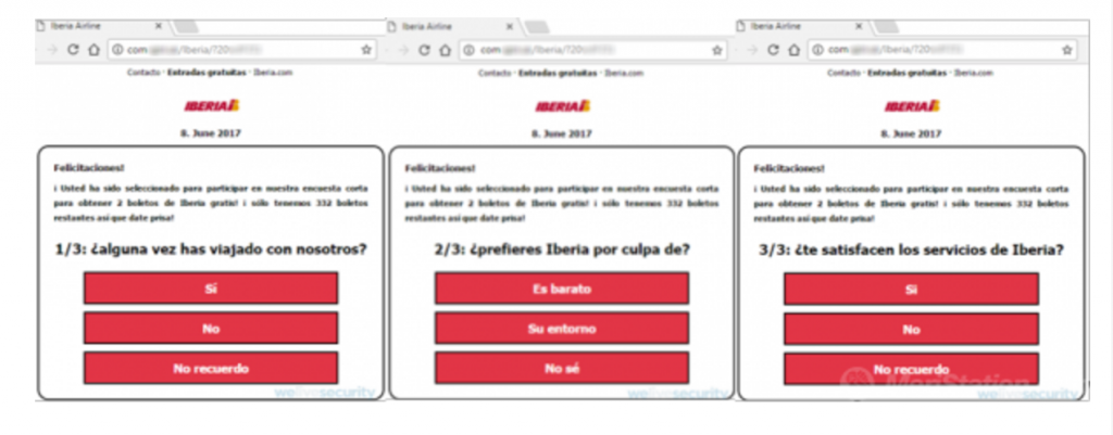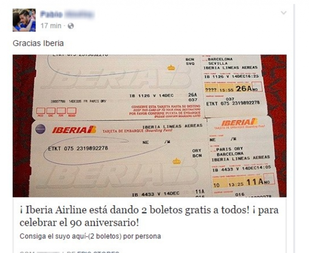 Engaña a los usuarios diciendo que pueden ganar boletos gratis y que hay muchos disponibles, obvio la aerolínea Iberia informo que esa campaña no fue realizada por la marca si no que es causante de los ciberdelincuentes para engañar a los usuarios haciéndolos participar e una encuesta de tres preguntas también al darle me gusta se propaga a tus contactos causando efecto domino.