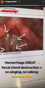 “Destrucción de cuerda vocal=no cantar, no hablar” Escribió Eiza en su publicación donde compartió con emojis de llanto y tristeza.