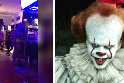 Pennywise, el payaso aterrador de It, se le vio cantando en un bar a todo pulmón, y con lágrimas en la cara, la canción de «Ya te olvidé» de la cantante Yuridia.