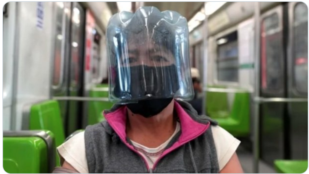 El estar protegidos un asunto muy importante últimamente, así que María ha decidido usar un garrafón en la cabeza, para su traslado en el metro de la CDMX y así evitar el COVID-19.
