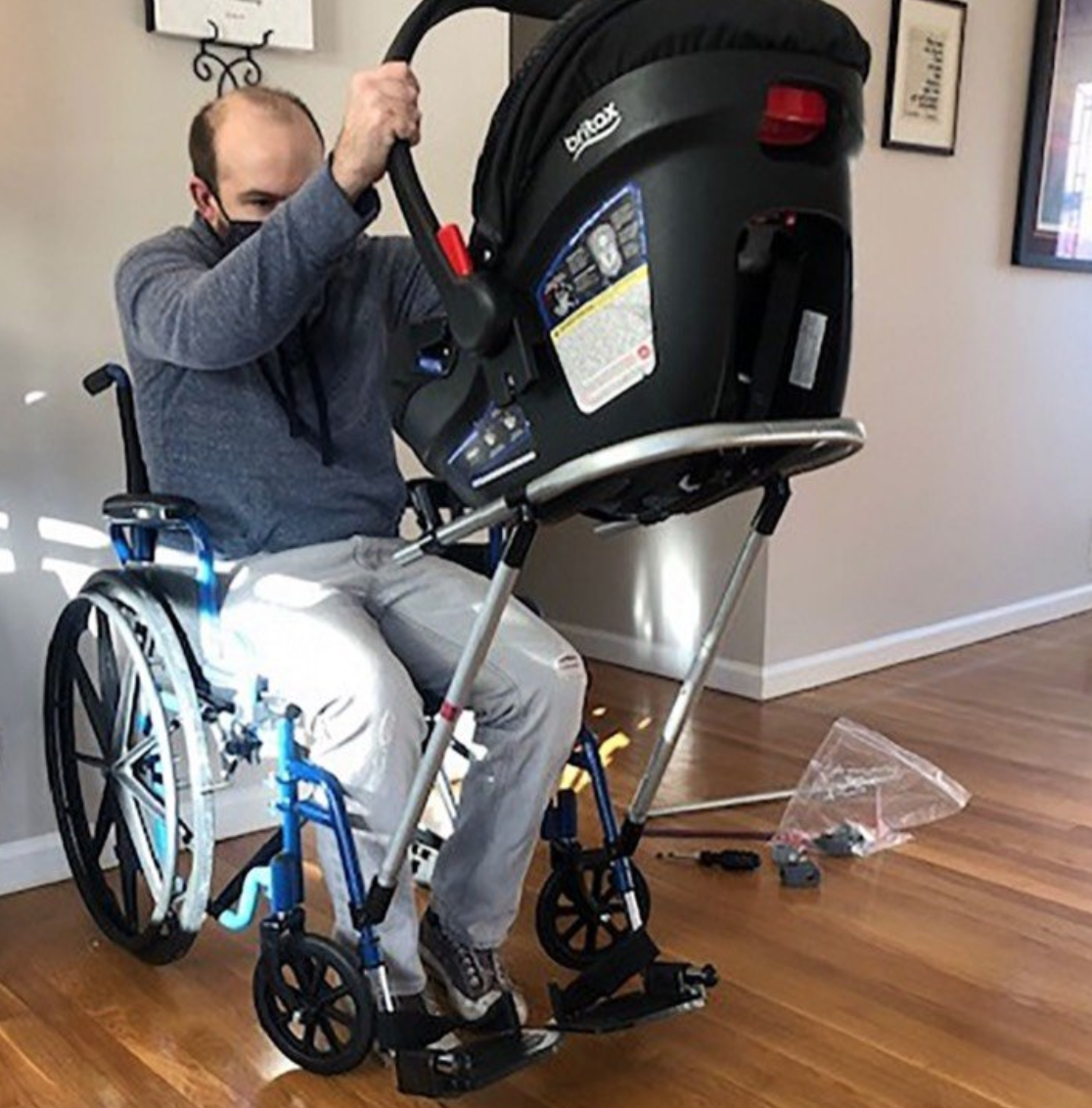Si bien puede caminar un poco, no puede hacerlo con la seguridad de cargar a un bebé. Así que decidimos: ‘está bien, ¿qué necesitamos para que él se sienta como un padre seguro?’ y, honestamente, no surgieron muchas ideas, simplemente porque no hay muchos recursos para los padres con discapacidad.