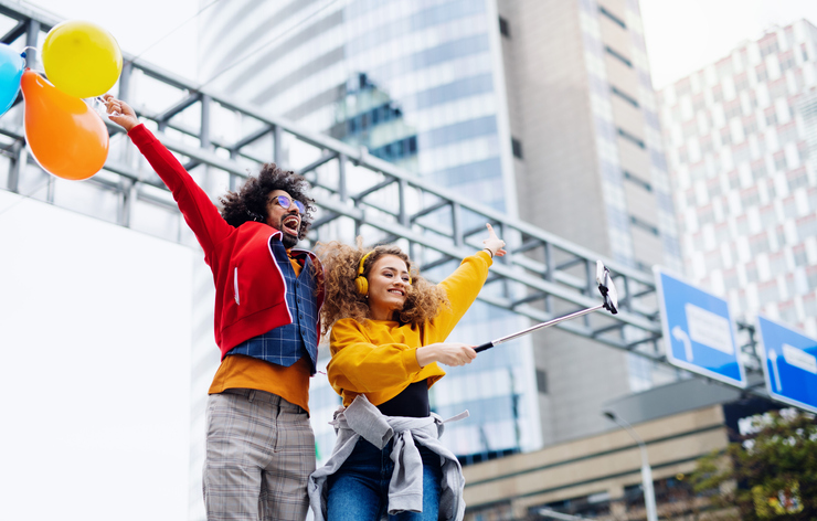 Portrait of young couple with smartphone making video outdoors on street, tik tok concept.