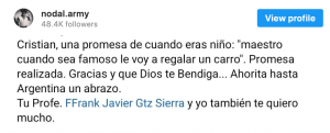 “Los tiempos De Dios son perfectos… Gracias Kisha… Christian, una promesa de cuando eras niño: ‘Maestro, cuando sea famoso le voy a regalar un carro’ promesa realizada. Gracias y que Dios te bendiga. Ahorita hasta Argentina un abrazo. Tu profe Frank Gutiérrez y yo también te quiero mucho”