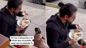 Fue así que su caso se hizo viral por medio de TikTok en donde colocaron como texto “CC va a desayunar y te dicen que no puedes pasar con tu mascota” así se puede ver a un chic sentado en los escalones de la puerta del restaurante comiendo su desayuno junto a su perrita.