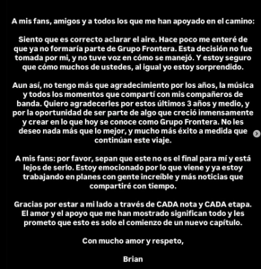 Tras anunciar su salida de Grupo Frontera y aclarar que fue una decisión obligada, se dirigió a sus fans y les aseguró que no es el final de su carrera y que ya está trabajando en futuros proyectos.
