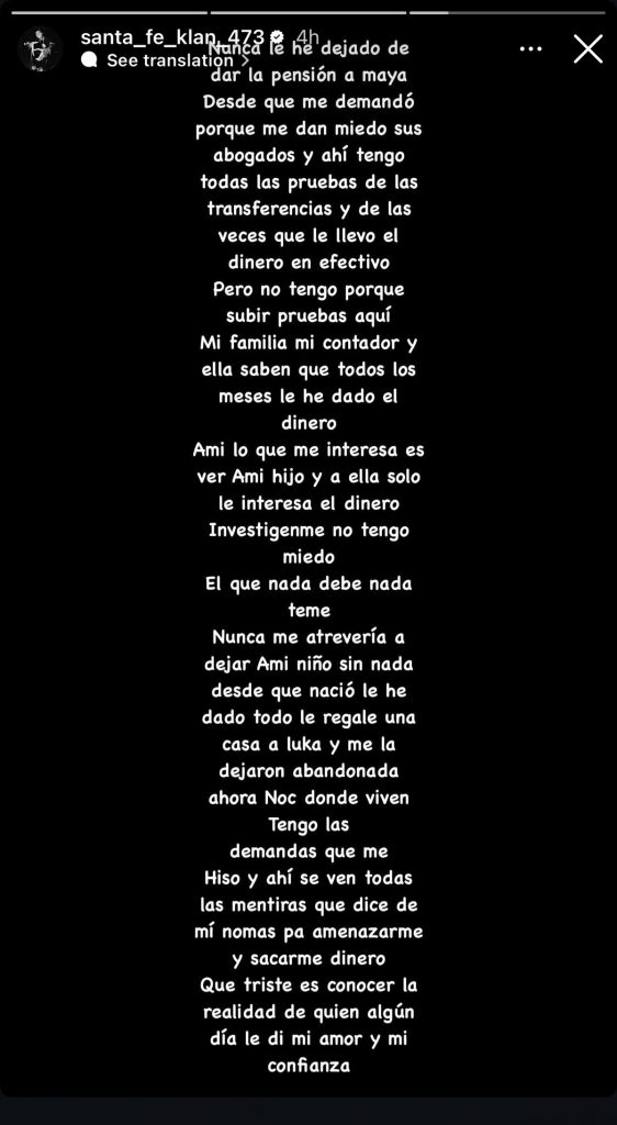 «Nunca le he dejado de dar la pensión a Maya desde que me demandó porque me dan miedo sus abogados y ahí tengo todas las pruebas de las transferencias y de las veces que le llevo el dinero en efectivo, pero no tengo porque subir pruebas aquí. Mi familia mi contador y ella saben que todos los meses le he dado el dinero».