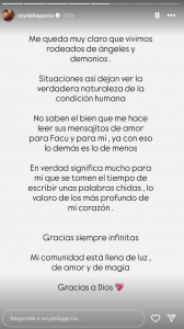 No saben el bien que me hace leer sus mensajitos de amor para Facu y para mí, ya con eso lo demás es lo de menos. Mi comunidad está llena de luz, de amor y de magia. Gracias a Dios”.