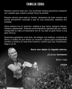 “Xava siempre fue un guerrero, amaba lo que hacía, siempre intenso, siempre apasionado, estamos profundamente agradecidos por haber compartido la vida y el escenario con él, ha sido un gran honor y una gran fortuna”, se lee.