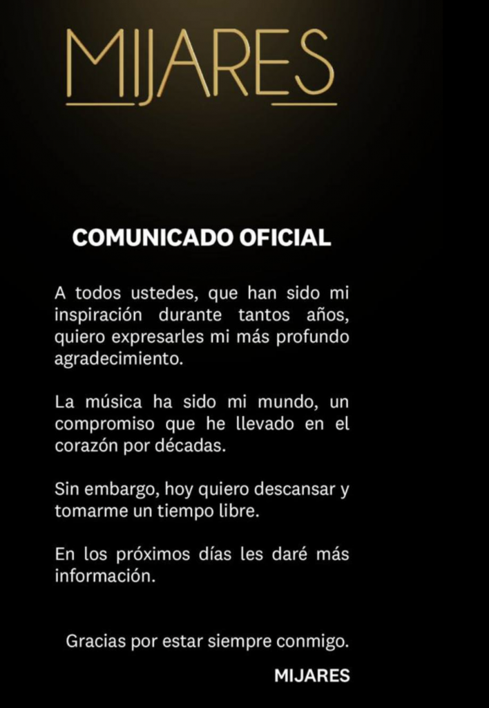 Hasta el momento, Mijares ha dejado claro que se trata de una pausa temporal, y no de un retiro definitivo. Sin embargo, la noticia ha generado reacciones emotivas en redes sociales, donde fans y colegas han manifestado su apoyo y cariño hacia el cantante.