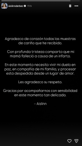 “Gracias de corazón por todas las muestras de cariño. Con profunda tristeza comparto que mi mamá falleció a causa de un infarto”, expresó.