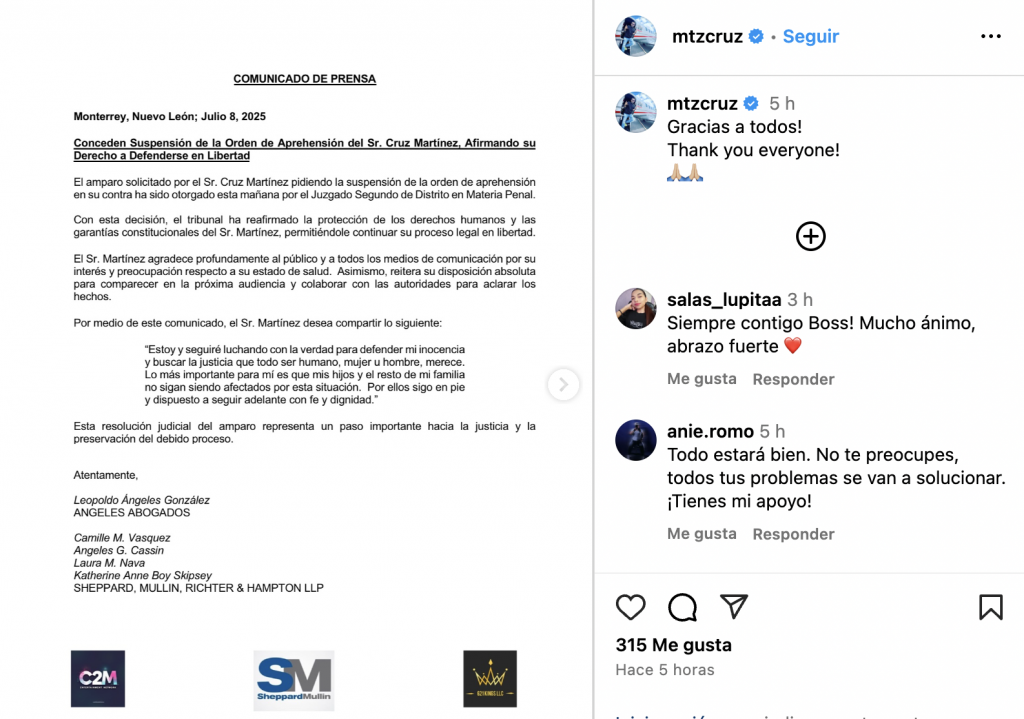 En un comunicado, firmado por Ángeles Abogados -sus asesores legales-, Martínez informa que, esta mañana, el Juzgado Segundo de Distrito en Materia Penal del estado de Monterrey, le otorgó el amparo que solicitó, con el que hizo la petición de seguir con su proceso en libertad.