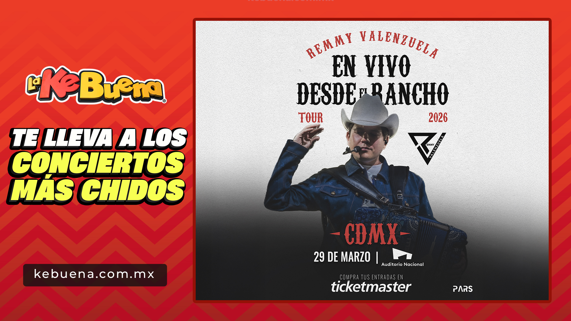 El talentoso cantautor y acordeonista Remmy Valenzuela, conocido como ”El Príncipe Del Acordeón”, regresa a la Ciudad de México con su gira ”En Vivo Desde El Rancho Tour 2026”, en el Auditorio Nacional y tu podrás ser testigo de un espectáculo inolvidable.