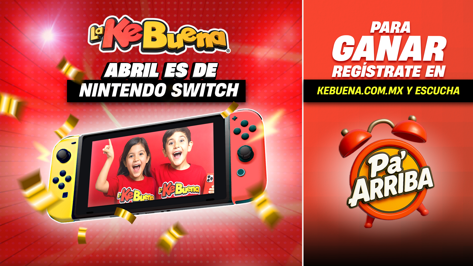 Porque en La KeBuena celebramos a lo grande el día del niño con Nintendo Switch GRATIS, y ganarlo será muy fácil, solo deberas escuchar el Morning Show #1 de la radio, Pa´Arriba de 6 a 11 de la mañana con Luis Martinez ”El Gallo”, Alejandro Guzmán ”El Kokodrilo”, Magua Romero ”La Hormiga” y Adrian Padilla ”El Mamut”, porque durante el mes de abril buscarán un ganador por semana, que se llevará a casa esta increíble consola.